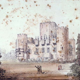 Er sieht Dächer drum herum ist eine Mauer, es ist ein Dorf oder eine Stadt. Er sieht Wappen, Ritterwappen, sein Wappen.